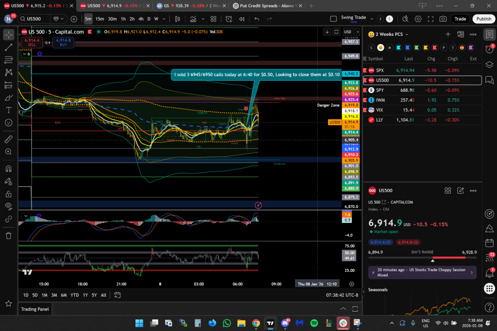 Today was one of those days where I probably should have waited, I Would have definitely been able to get more premium if i just waited but sometimes fomo beats the best of us. Deltas were signaling for downside however markets pumped up to the previous day close range. I sold calls because i felt deltas were more probable of happening but i got stopped out at $0.80 but then price started to hover so I got in at $0.70. If I was to do my calculations correctly instead of selling $0.50 per contract I basically sold each one for $0.40. As of now its 7:49 and its currently sitting at a 10% loss now. But I think if it goes lower I can take profit at $0.10. I definitely know that from now on i should look at the ATR lvls and get in trades when one is close to breaching or has breached and use it for confirmations on the VWAP as well as the 9/20 emas. Will post an update in 30 minutes if the markets do anything or an hour later from now if I’m still in the trade. My stop loss is a close above the purple line which is the previous day close.