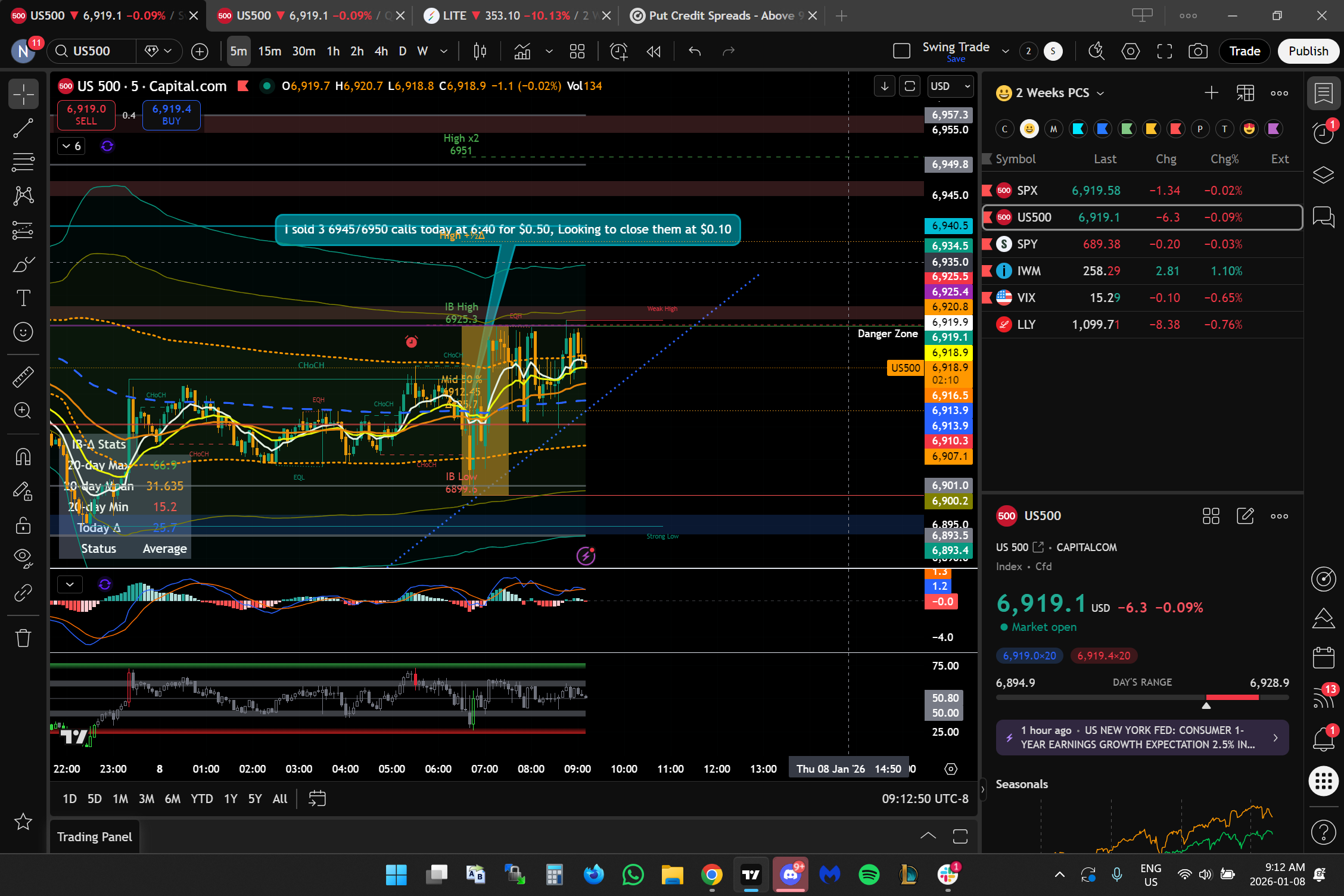 Today was one of those days where I probably should have waited, I Would have definitely been able to get more premium if i just waited but sometimes fomo beats the best of us. Deltas were signaling for downside however markets pumped up to the previous day close range. I sold calls because i felt deltas were more probable of happening but i got stopped out at $0.80 but then price started to hover so I got in at $0.70. If I was to do my calculations correctly instead of selling $0.50 per contract I basically sold each one for $0.40. As of now its 7:49 and its currently sitting at a 10% loss now. But I think if it goes lower I can take profit at $0.10. I definitely know that from now on i should look at the ATR lvls and get in trades when one is close to breaching or has breached and use it for confirmations on the VWAP as well as the 9/20 emas. Will post an update in 30 minutes if the markets do anything or an hour later from now if I’m still in the trade. My stop loss is a close above the purple line which is the previous day close.