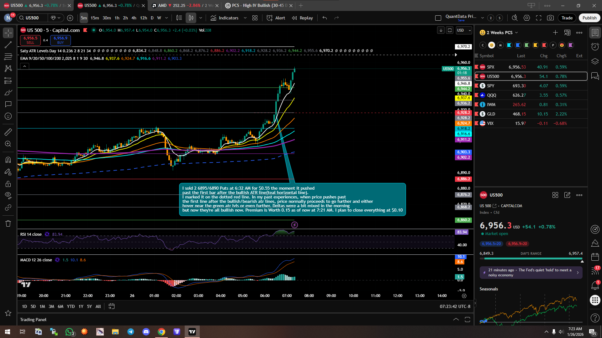 So today, I made a play based on my past experiences. I sold puts the moment price broke out past the first level after the bullish atr level which I marked with the dotted red line. From past experiences, I noticed that a good 90% of the time price would continue further until it reached the green trigger level and sometimes would go even further. It was the same for the bearish atr level. If price went past the first line after the bearish atr level, it would continue further normally. Deltas at the time were a bit mixed but majority of them were bullish and the 9/20 ema lines(white/yellow) were also pointing for short term bullishness. Price was also outside of the SD1 from VWAP which means that as long as price stayed outside the bands, we would continue to go upside. The strikes I chose were 6895/6890 Puts. It was the closest to $0.60 premium. The price I had been able to sell was $0.55. As of now I do believe I should be able to close at $0.10 premium if price just hovers around this area for another hour or two. It is currently 7:36 AM PST.
