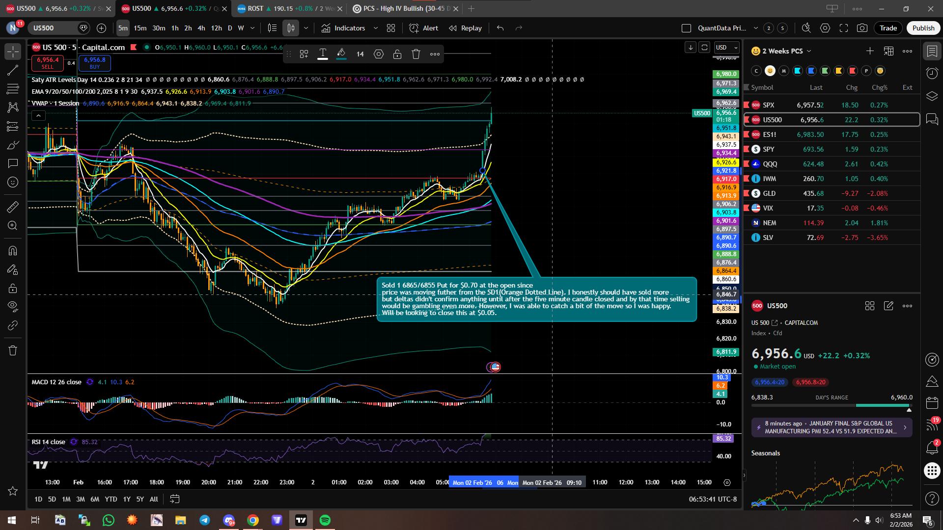 I opened a 6865/6855 Put for $0.70 at 6:32 AM PST. The reasoning why I sold this was because there was a strong push up outside of the standard deviation 1 of Vwap which is the orange dotted line. I’m looking to close at $0.10. Will close my position if price decides to go the other way and close a candle stick below 6915. That is my stop loss for the day.