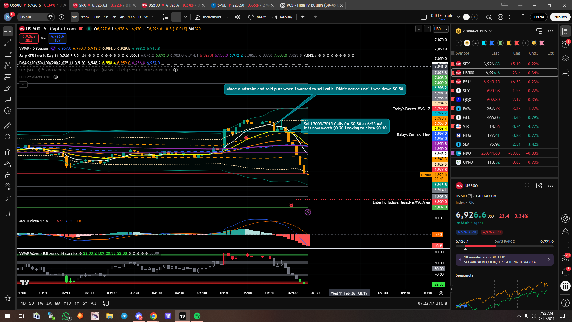 So I messed up today. I should honestly wait for the first ten minutes to settle. Price broke through the first bar ATR level of the upside but didn’t hold. I thought i would continue higher so I sold puts. However it pulled back past the Teal horizontal line. So I closed my position for a $50 loss and sold calls. The strikes I chose were 7005/7015. I sold for $0.80 Premium. Today I’m just looking to make a bit and not go heavy. Will be doing more swing trades however, I’ll probably do one or two daily trades to scratch my itch. From now on I don’t think i’ll get into any position until after 10 minutes have at least passed.
