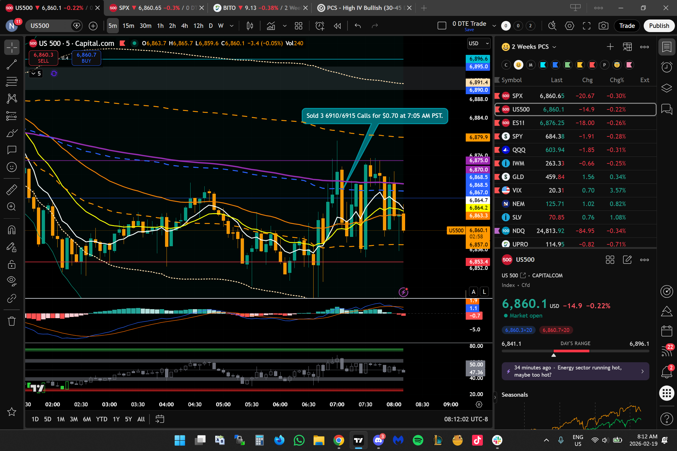 Sorry for the late post. As you can see price was very volatile today so I had to keep my eyes peeled on the screen incase price continued further up. I sold 3 – 6910/6915 calls for $0.70, 30 minutes after the open at 7:05 AM PST. Deltas didn’t look good at that moment but right now they seem to have gotten a bit stronger on the call side. If more deltas turn green i might close my position for a loss. I set a stop loss at a candle close at 6885. Its either that happens or I close my positions at $0.20.