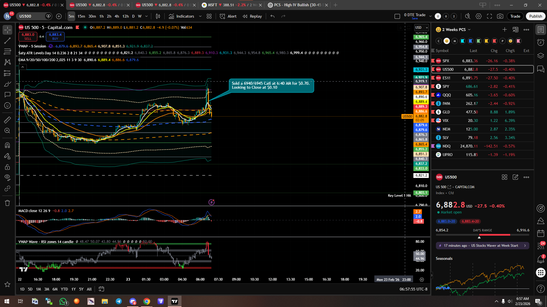 SPX 0DTE – 02/23/26 February 23, 2026February 23, 2026 by raylong I sold a 6940/6945 call for $0.70 at the open when I saw that big orange candle down. Deltas had also flipped red as well. I set a stop loss for high of day or close for $0.05. I was able to close these at 8:05 AM PST for $0.05