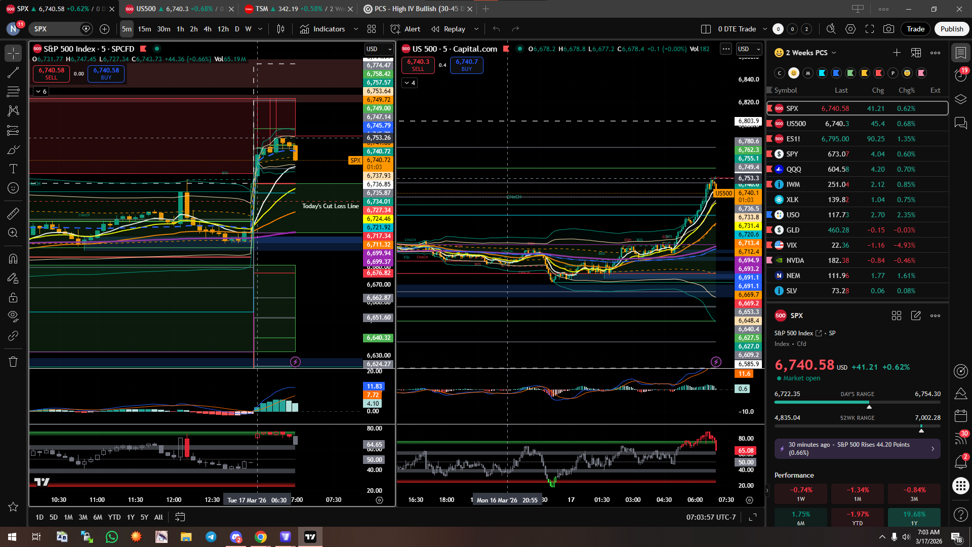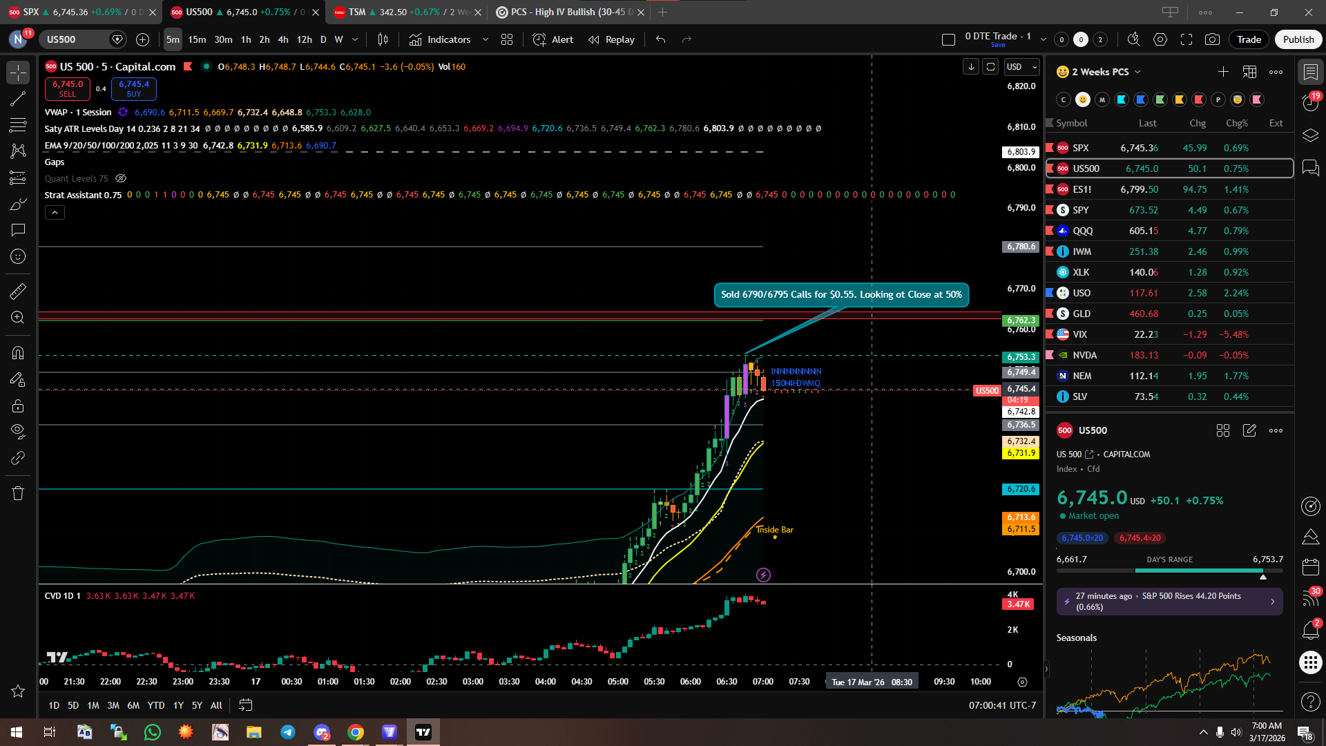 So everything pointed for short term upside. I waited until premium for the strikes that were 10 points further than the current MVC(SPX6780) were at least $0.55. I sold 3 call credit spreads at 6790/6795. I was originally going to aim to close at 50% if it continued further but now it is set to close at $0.10 since price is going down and went below VWAP on SPX. If price climbs back above the topside of SD1 (top orange dotted line on SPX 6749) then I’ll close for 50%.