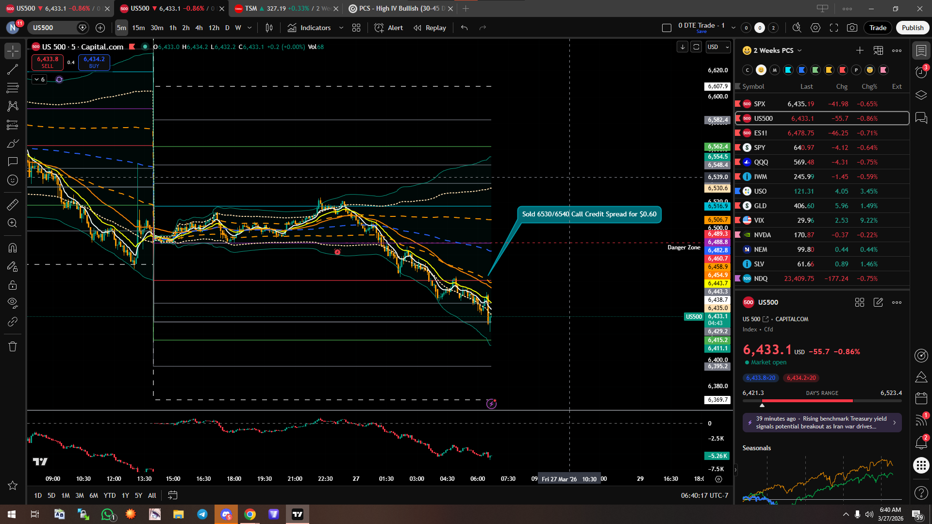 Due to the deltas pointing for more downside, I sold 2 call credit spreads at 6530/6540 for $0.60. Looking to close at $0.05 unless price goes above 6488. If it does then i’ll look to close for 50%