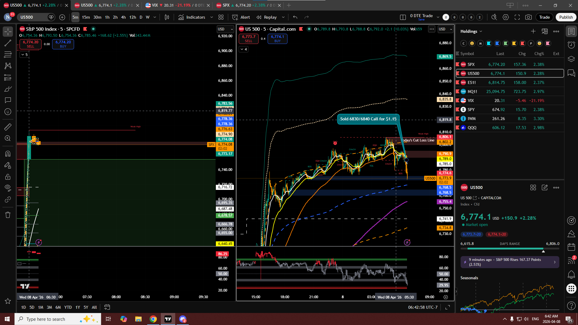 So yesterday night, The Iran Ceasefire with US happened and price jumped up 175 points. Trump basically chickened out after sending all those tweets. I decided to go against the trend as we went so far up, normally price tends to want to go back to vwap at least. Positive MVC Started at 6800 at 6:30 AM PST. I sold one call credit spread for $1.10 at strikes 6830/6840 at 6:32 AM PST. I set a stop a loss at the high of the SPX Premarket which is shown on US500 which is 6806.1. I’m looking to close these for $0.05 if they stay below vwap after two hours. If price hits my stop loss ill look to close at breakeven or 50%.