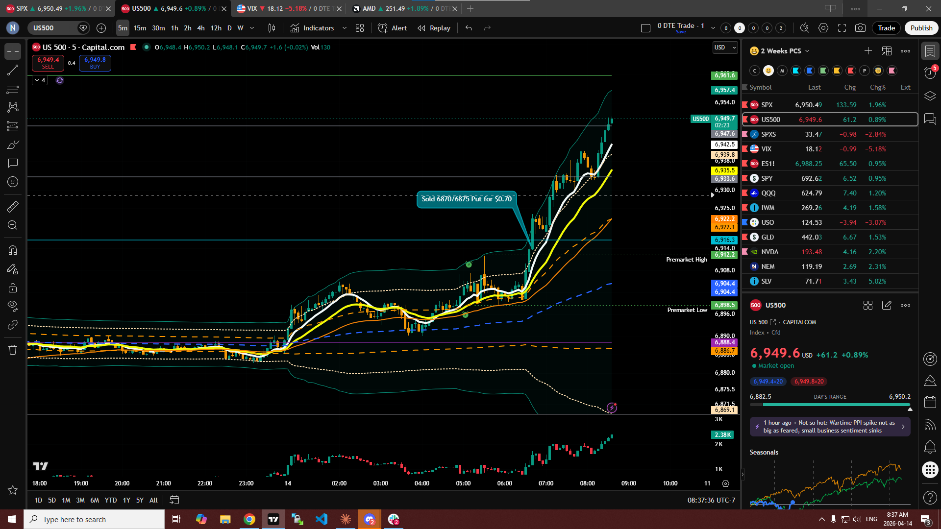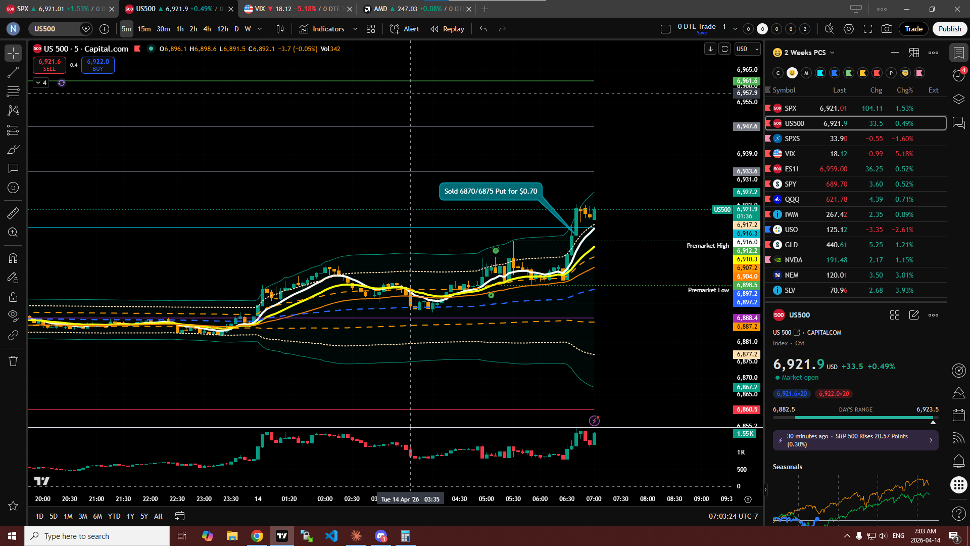 Today’s open looks like it wants to push up. Gamma and Delta Look strong, however for some reason price is so slow climbing up. Could be that we are in low IV. I sold a 6870/6875 put credit spread for $0.70 at the open and then also sold 6875/6865 Put credit spread for $0.75 as it broke out of the premarket high. Looking to close these at $0.10