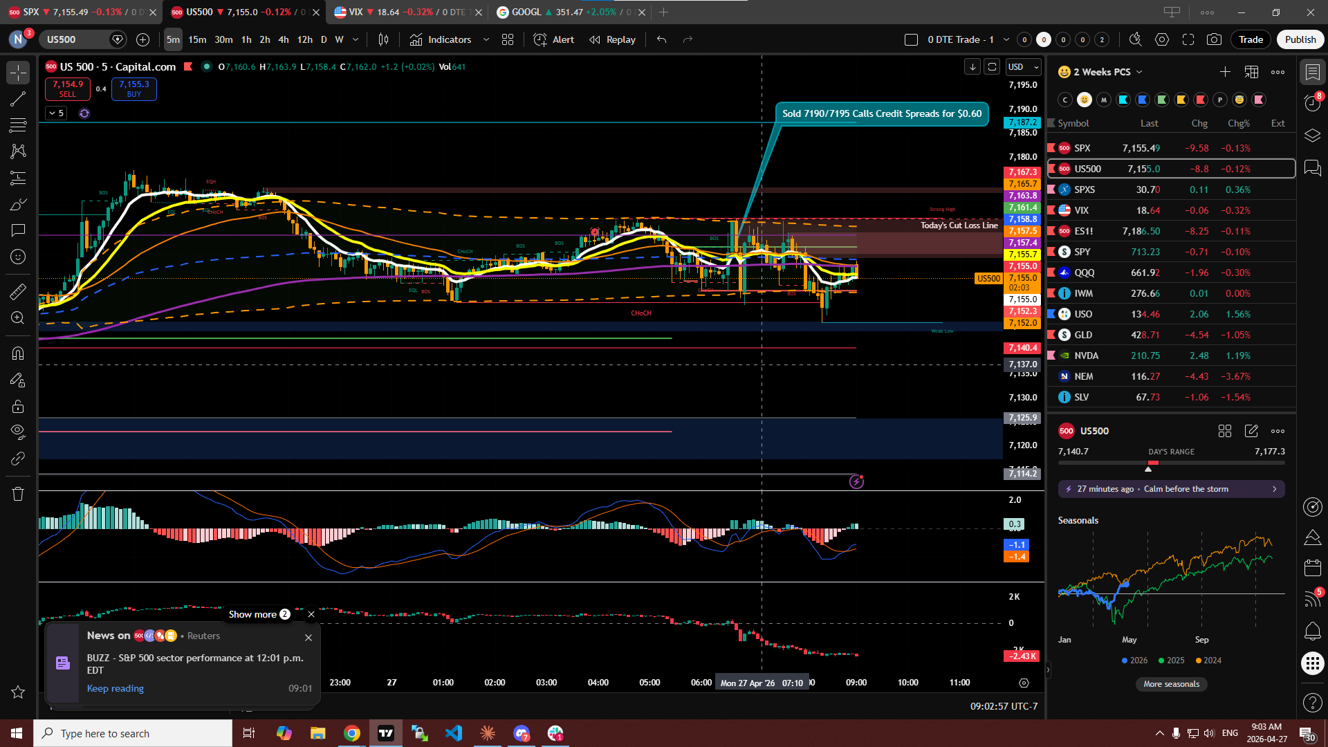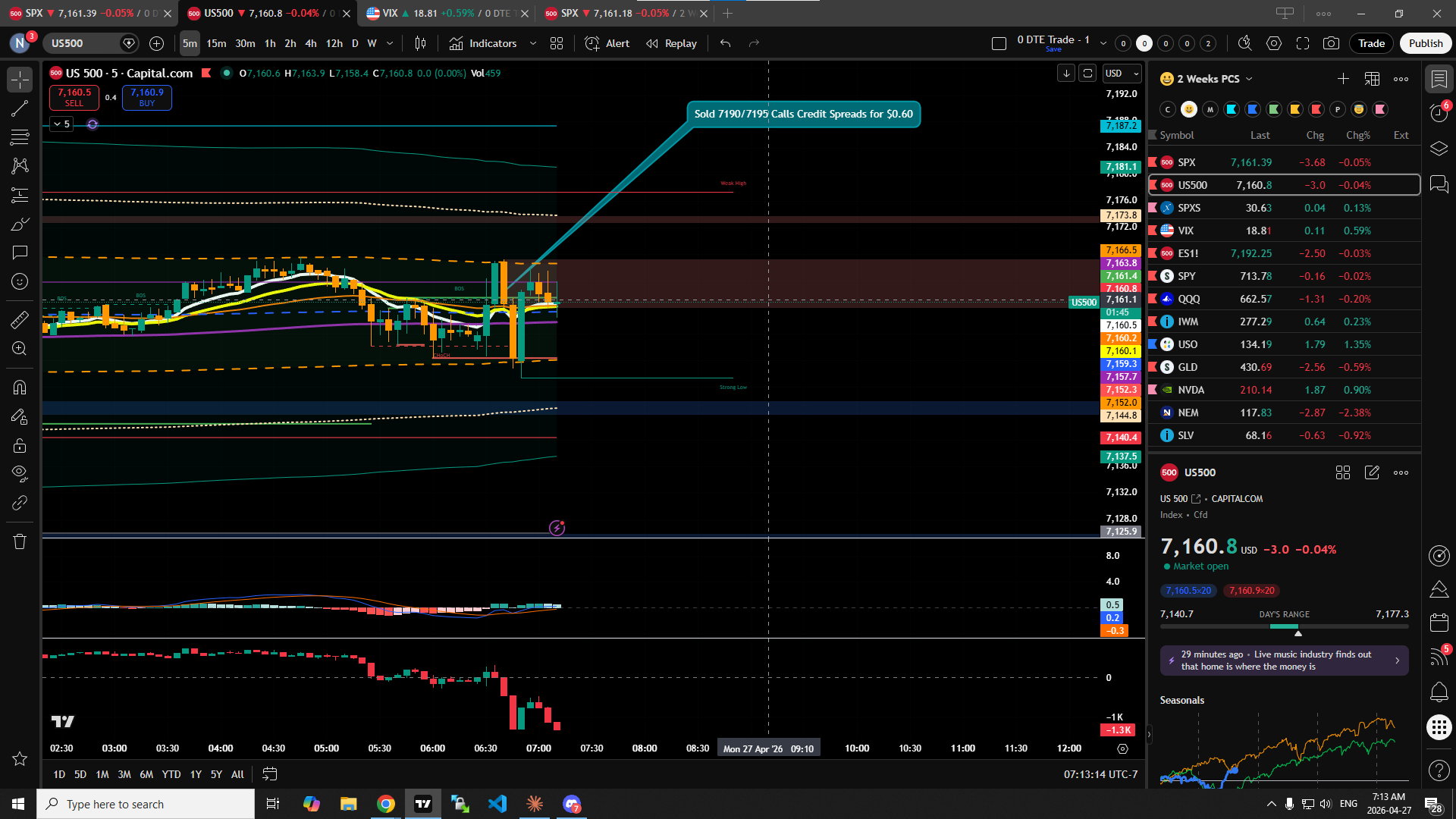 So After the first fail at the attempt of going past SD 1, I sold 2 call credit spreads at 7190/7195 for $0.60. My cut loss is a close above the upper SD1(7166.5)(Orange dotted line).