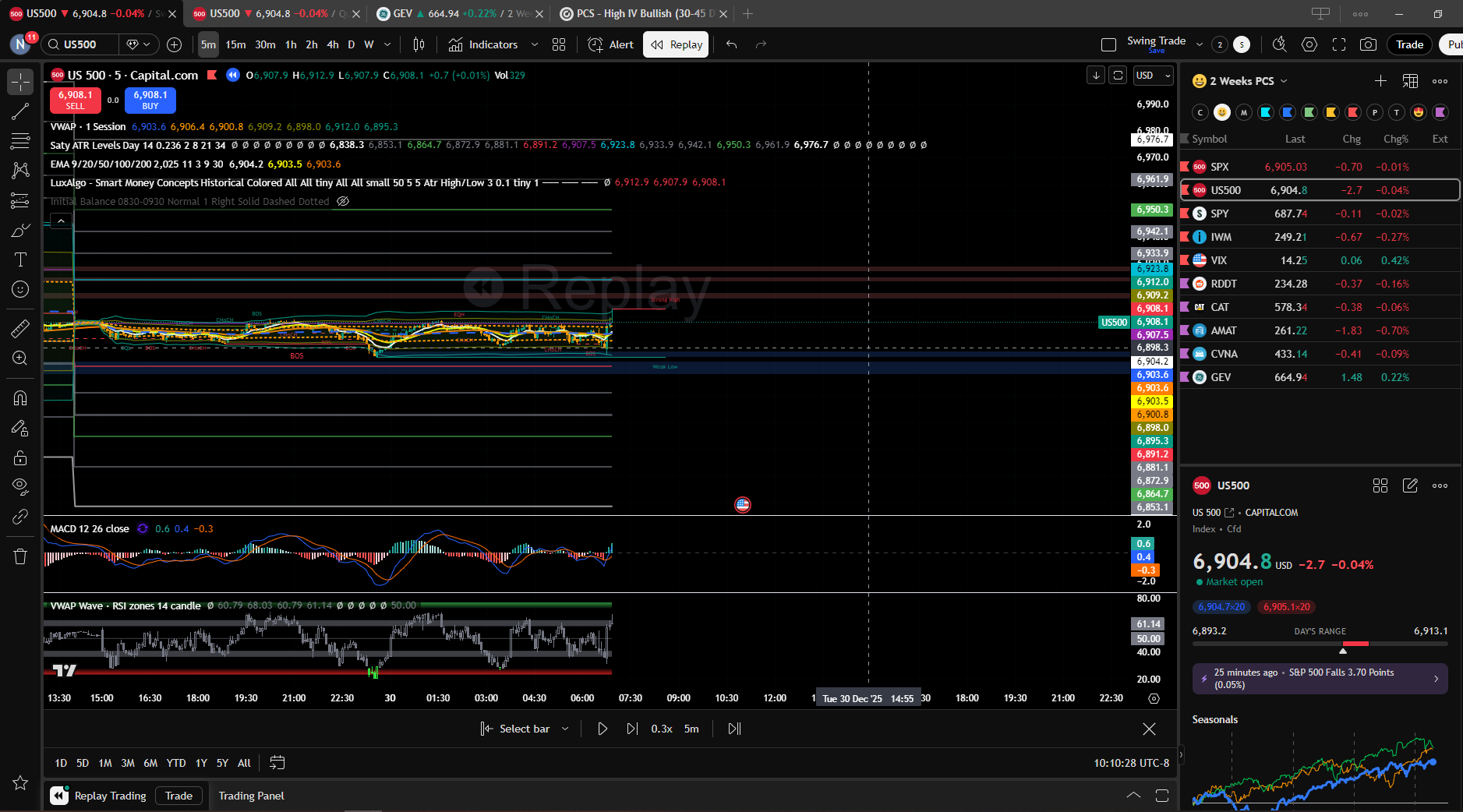 Based on the premarket data from US500, I could tell today the ranges for SPX were most likely gonna be small and contained as the Standard deviation from Vwap were still small at the open and didnt expand even when price touched the area where 3 standard deviations from vwap was. I sold 2 contracts of 6870/6865 puts for $0.50 premium when price was below vwap which is the blue dotted line. My stop loss was going to be two closes below the red horizontal ATR Level (6891.2). I was able to close both contracts around 8:10 AM PST. for $0.10.